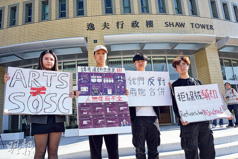 【明報專訊】受浸大學生等持份者爭議數個月的文學院和社會科學院合併方案,昨在教務議會大比數通過,將交上校董會審議,倘獲通過,兩院今年7月正式合併。「文院社科院合併關注組」4名學生昨於會前在校外默站,呼籲教務議會成員否決方案。關注組成員戴嘉平對方案通過感遺憾和失望,稱該組下一步嘗試說服校董會成員否決合併。