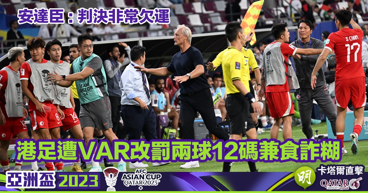 港足在卡塔爾亞洲盃決賽周首擊,在C組分組賽輸2球12碼下,以1:3負阿聯酋隊。當中有3次被視像裁判(VAR)推翻判決,包括兩球12碼及一球詐糊。主教練安達臣賽後直言不滿球證判決及感到非常欠運。