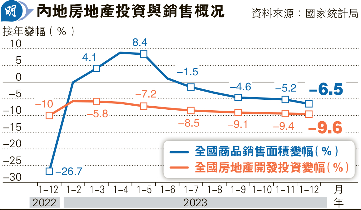 內地去年房地產開發投資11.09萬億元(人民幣,下同),按年跌9.6%(見圖),其中,住宅投資8.38萬億元,按年下降9.3%;全年商品房銷售額11.66萬億元,按年下降6.5%,其中住宅銷售額跌6%。至於商品房銷售面積11.17億平方米,按年跌8.5%,其中住宅銷售面積跌8.2%。至去年末商品房待售面積6.73億平方米,按年增19%。其中住宅待售面積增22.2%。