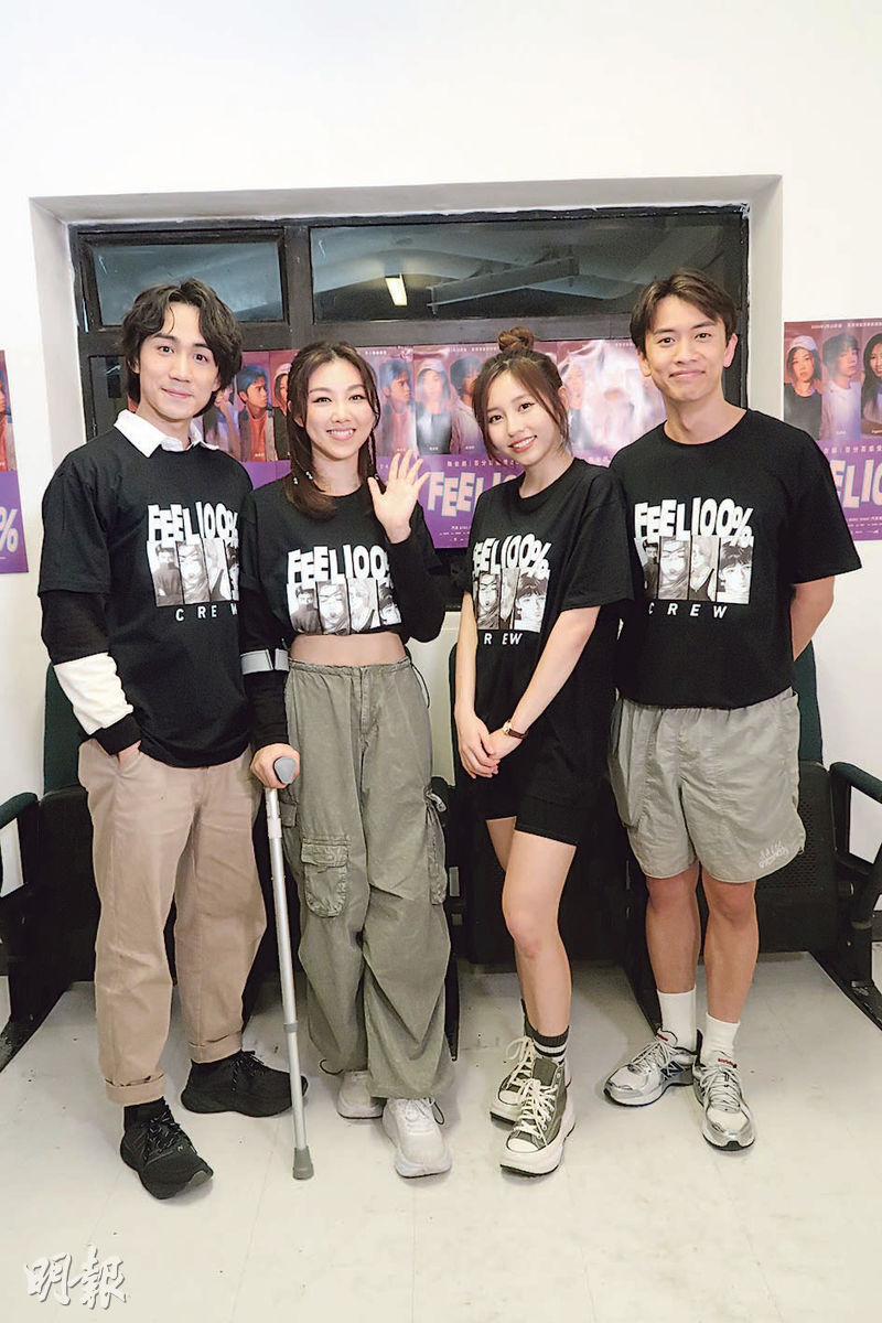 【明報專訊】顏卓靈、COLLAR成員蘇雅琳(Ivy So)、吳肇軒、林家熙(Locker)主演舞台劇《百分百感覺2024》,前晚於灣仔演藝學院開鑼。COLLAR成員許軼、沈貞巧、李芯駖與邱彥筒,還有袁澧林、梁祖堯和徐天佑等捧場。首次演舞台劇的Ivy So向Locker獻「初吻」,Locker則半裸騷8嚿腹肌。僅穿內褲的吳肇軒與女演員胡偉寶演激烈牀戲嗌緊張,Locker與吳肇軒大講粗口對白,引得台下觀眾尖叫。顏卓靈綵排時傷腳,十字韌帶及半月板撕裂,前晚帶傷上陣,全程撐拐杖演出。