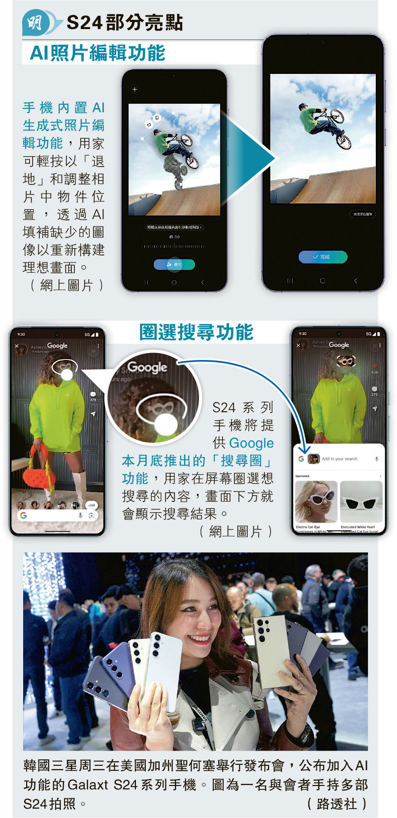 三星發布的S24、S24+及S24 Ultra三款手機均載有「Galaxy AI」,三星形容是「開啟流動AI的新時代」。三星手機的AI功能結合其自家生成式AI引擎及與Google合作。當中最受注目的功能無疑是通話即時翻譯,可把通話雙方的語音即時翻譯成指定語言,亦能同步檢視文字翻譯,支援包括中文等13種語言。此外,手機亦內置AI生成式照片編輯功能,用家可輕按以「退地」和調整相片中物件位置,透過AI填補缺少的圖像以重新構建理想畫面。S24系列手機亦將提供Google本月底推出的「搜尋圈」(circle-to-search)功能,讓用家在屏幕圈選想搜尋的內容,畫面下方就會顯示搜尋結果。