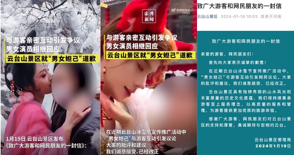 河南雲台山景區近日推出「男女妲己」Cosplay(角色扮演)與遊客互動,扮演者以親暱姿態和遊客摸手摸臉、隔空親吻,在網上大受歡迎,卻引來官媒批評。繼扮演者道歉後,景區管理局今(19日)發布《致廣大遊客和網民朋友的一封信》稱「大家的批評和建議,我們誠懇接受、已經改正。」相關報道:景區男女妲己被批低俗 演員道歉停工 官媒指衝撞大眾承受度 網民:遊客願意媒體不願意
