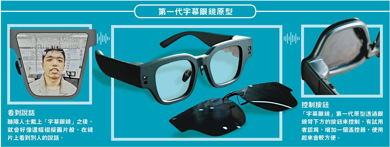以往曾經有公司提出另一種方案,讓普通人在智能手機上安裝一套視像辨識軟件,來辨識聽障人士的手語,以解決雙方溝通問題。但蕭啟穎覺得,要即時視像辨識手語,難度比即時語音辨識大。所以,該公司選擇了技術相對成熟的語音辨識方案。經過大約半年研發,該公司去年底已經造出字幕眼鏡第一代原型,重約100克,配備一枚800mAh鋰電池,充滿電約需1小時,之後可連續用3小時。鏡片方面,有透明鏡片和太陽眼鏡鏡片兩種選擇。第一代原型暫時必須透過Wi-Fi,連線到智能手機或路由器上網才可運作,它使用微軟雲端服務將語音即時辨識成文字。