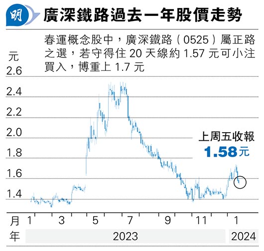 况且,近日廣深鐵路股價表現算硬淨,就算上周未能倖免跟隨大市捱沽,但過去1個月仍錄得近一成升幅,期內恒指則累瀉6.7%;在春運開始前,若守得住20天線約1.57元可小注買入,博重上1.7元。