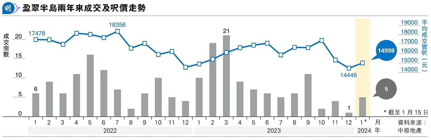 【明報專訊】踏入2024年,二手市場氣氛好轉,不少業主願意減價放盤,吸引買家入市,令成交量增加。本月截至15日,青衣指標屋苑之一、位於青衣港鐵站上蓋的盈翠半島暫錄5宗成交,較上月同期錄1宗成交急增。事實上,青衣區本月已累錄23宗買賣成交,快追平上月全月25宗。