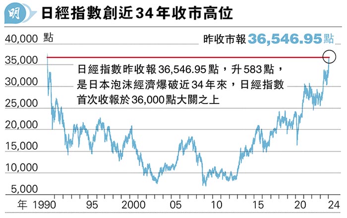 【明報專訊】受半導體需求復蘇的預期提振,晶片股領漲,推動日經指數周一收市升583點,收報36,546.95點,是日本泡沫經濟爆破近34年來,日經指數首次收報於36,000點大關之上。受Nvidia(美:NVDA)等晶片股上周的升勢帶動,標普500指數上周五創新高,並推動日本科技股上漲。 東京威力科創(Tokyo Electron) (日:8035)及半導體測試設備商愛德萬(Advantest) (日:6857)連升4天,並創上市以來新高。這兩隻股票推動日經指數昨上漲逾百點,高見36,571.8點,刷新近34年高位。