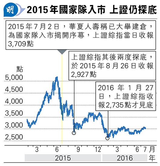 根據彭博截至本周一的資料,內地滬深兩市總市值約60.5萬億元人民幣。回顧上次2015年A股股災,上證綜指由6月中高位逾5200點,急挫至7月初近3900點低位時平準基金開始入市(見圖)。上證綜指在數日後跌至約3700點初步喘穩後,至同年8月底及2016年1月底兩度探底,跌近2700點才反覆回升。