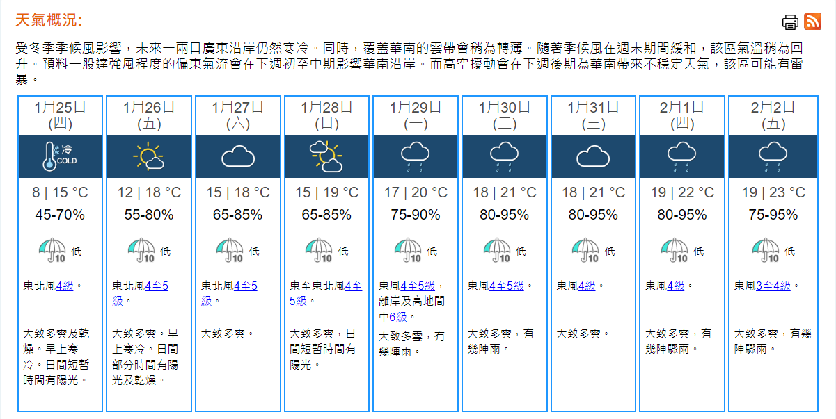 本港今日早上嚴寒,高地有可能結冰。大致多雲。日間乾燥,最高氣溫約11°C。吹和緩至清勁偏北風,初時離岸及高地間中吹強風。展望明日(25日)及周五(26日)早上仍然寒冷,日間天色較為明朗,周末期間早晚清涼。(天文台)