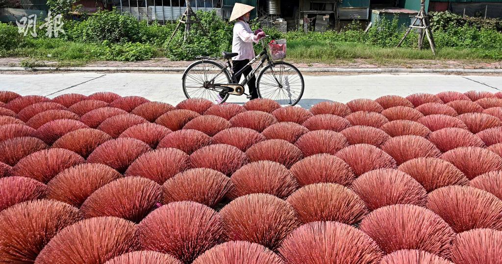 農曆新年將至,越南河內小村莊Quang Phu Cau的村民正忙碌製香,趕及新年前交貨,供越南人燒香拜佛。村民會先用機器將竹削成竹支,並浸入彩色染料桶,為香染上鮮紅及粉紅色,之後紮成一束束「香球」,齊整地排在地面風乾,為這條「香村」構成獨特景色。