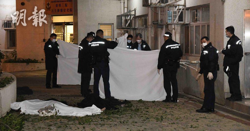 警方圍封現場,分別以白布及黑膠袋覆蓋事主遺體,正調查兩母子墮樓原因。探員及鑑證科人員今早在場蒐證,至下午1時許,仵工將兩人遺體舁送殮房。