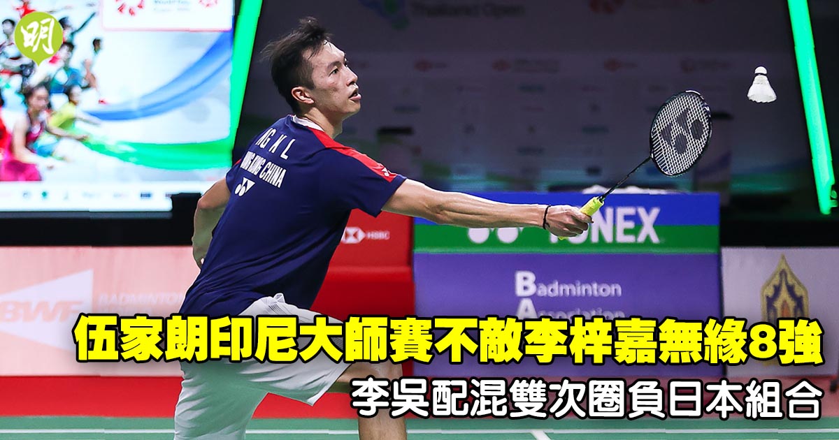 印尼羽毛球大師賽今(25日)假雅加達續演,港將伍家朗在男單次圈力戰下,以局數0:2負大馬籍球手李梓嘉,另一港隊代表李晉熙/吳芷柔亦以直落兩局不敵日本隊的綠川大輝/齋藤夏,意味港隊全軍盡墨。