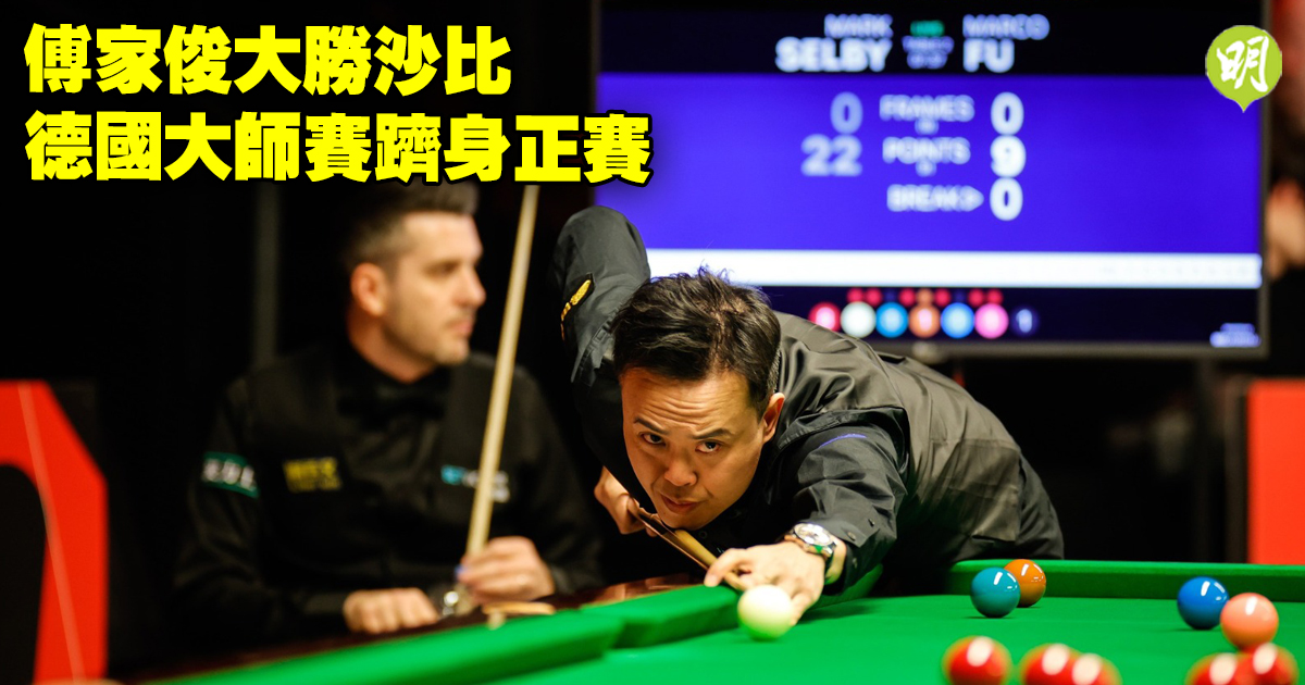 香港桌球一哥傅家俊(29日)昨於德國大師賽外圍賽三度「起break」,以局數5:1大勝世界排名第5的英籍星將沙比,闖入正賽64強鬥23歲小將艾菲戴維斯。