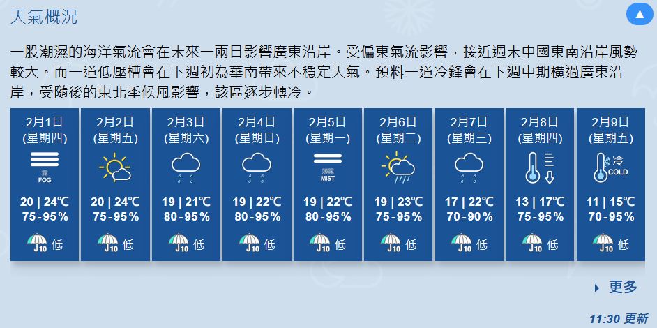 即時熱點 天氣|天文台:2月9日年三十料低見11°C (12:02) 發佈於 2 年 前 2024 年 1 月 31 日 By 明報 天文台預料一道冷鋒會在下周中期横過廣東沿岸,受隨後的東北季候風影響,該區逐步轉冷。據天文台9天天氣預報,2月8日(年廿九)開始轉冷,氣溫料低見13°C,至9日(年三十)進一步低至11°C。(天文台) 相關文章:天文台天氣天氣速遞編輯推介 Up Next 家居防蟲‧衣魚|對付衣魚兩招:定期清雜物、抽濕保乾爽 (11:28) 不要錯過 短片:法農示威 堆逾千車胎圍堵大樓 (13:01) 繼續閱讀 贊助商 猜你喜歡 天氣|天文台:周日早上市區最低14℃ 部分地區寒冷 (17:55) 天氣|天文台:多雲有幾陣雨 今晚轉涼降至約17℃ (09:25) 【Emily】天文台「矚目天氣及氣候事件選舉」 投票有機會獲紀念品 天氣|天文台:周六多雲有雨 晚上轉涼氣溫17至21°C 下周日跌至最低14°C (21:22) 天氣|天文台:短暫時間有陽光 最高19°C (08:24) 天氣|天文台:周四多雲早晚有微雨 氣溫介乎17至20°C (20:57)