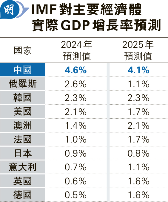 【明報專訊】國際貨幣基金組織(IMF)發表《世界經濟展望更新》報告,當中IMF指出如果中國不對陷入困境的房地產行業制定全面的一攬子重組政策方案,房地產投資的下降幅度可能會超過預期,而且持續時間更長,對中國內地經濟增長和貿易伙伴國產生負面影響。地方政府融資限制也可能引起意外的財政收緊,而在信心低迷的背景下,家庭消費也可能會減少。IMF預計中國2024年和2025年的經濟增速分別為4.6%和4.1%。IMF官員亦提出相比起降準,中國減息更能刺激需求。