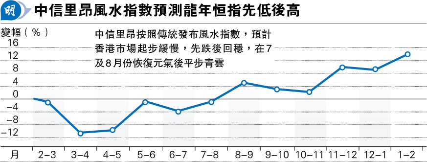 【明報專訊】「玉兔歸穴,青龍出淵」,兔年即將過去迎來龍年。中信里昂按照傳統發布風水指數,以風水角度剖析今年恒指走勢。該行指出,今年八字缺水,通常表示不利於貿易,而於1969年誕生五行屬土、生肖為雞的恒指,難以完全扭轉此趨勢,但八字角度而言則水氣充盈,應能確保門戶暢通。該行預計香港市場起步緩慢,先跌後回穩,在7及8月份恢復元氣後平步青雲,潛龍出淵,鱗光乍現,再達到新高。