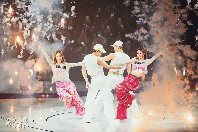 【明報專訊】Twins前晚舉行第9場紅館演唱會,衛詩雅、湯怡、伍樂城、莊文強及ERROR成員梁業(肥仔)、郭嘉駿(193)捧場。蔡卓妍(阿Sa)在握手環節時見到193即笑說︰「你唔好企起身,你咁高擋住後面。」引觀眾大笑,193全晚不敢站起來。