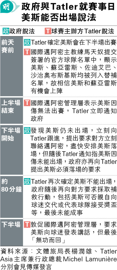 楊續稱,過了一段時間Tatler才告知政府美斯可能因傷不能出場,但未有「詳細講受傷情况」,政府在過程中有繼續跟主辦方說美斯上陣是「原先的安排」,希望對方繼續向球隊一直提出要求。他強調政府在過程中「有盡力做我們該做的事」,又指大家聽完所有解釋及了解整件事後,會有合理判斷責任誰屬。