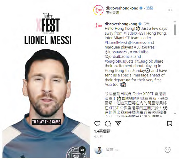 Tatler香港社交帳號上月中表示,「希望向廣大持有Tatler XFEST門票的球迷保證,國際邁阿密的所有明星球員,包括世界盃冠軍阿根廷隊長美斯」均會參加表演賽。其以美斯為主角的球賽宣傳近日遍佈全港,包括銅鑼灣崇光百貨外牆的大型電子熒幕、港鐵及巴士站廣告板、的士車身廣告,以及帆上印着美斯半身照的帆船在維港穿梭等。