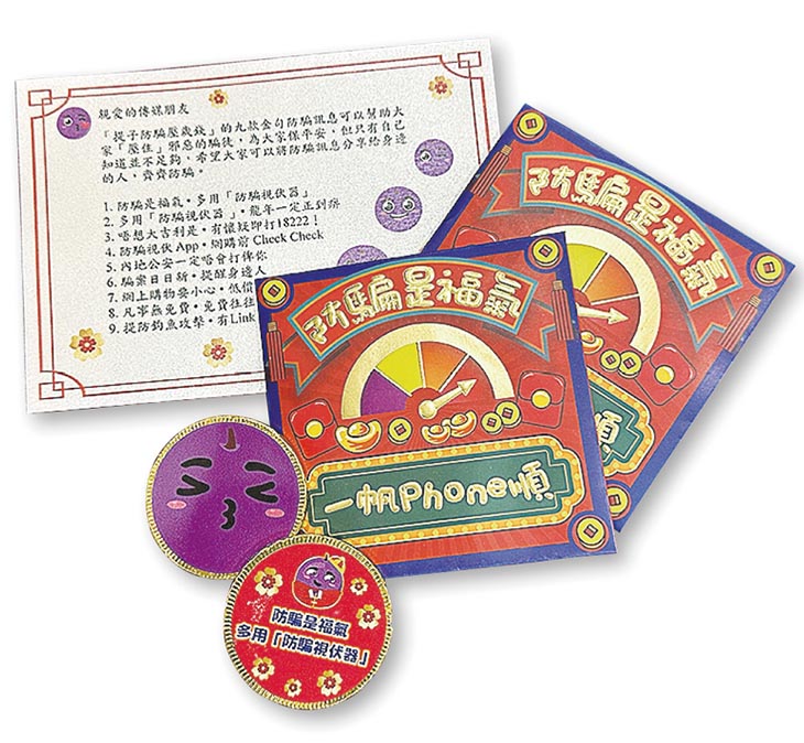 利市封封面印有「防騙是福氣」、「一帆Phone順」,前者取其「防騙視伏器」諧音;每個朱古力金幣分別貼上防騙吉祥物「提子」同9款不同防騙信息,包括「多用防騙視伏器,龍年一定正到痹」、「內地公安一定唔會打畀你」等。