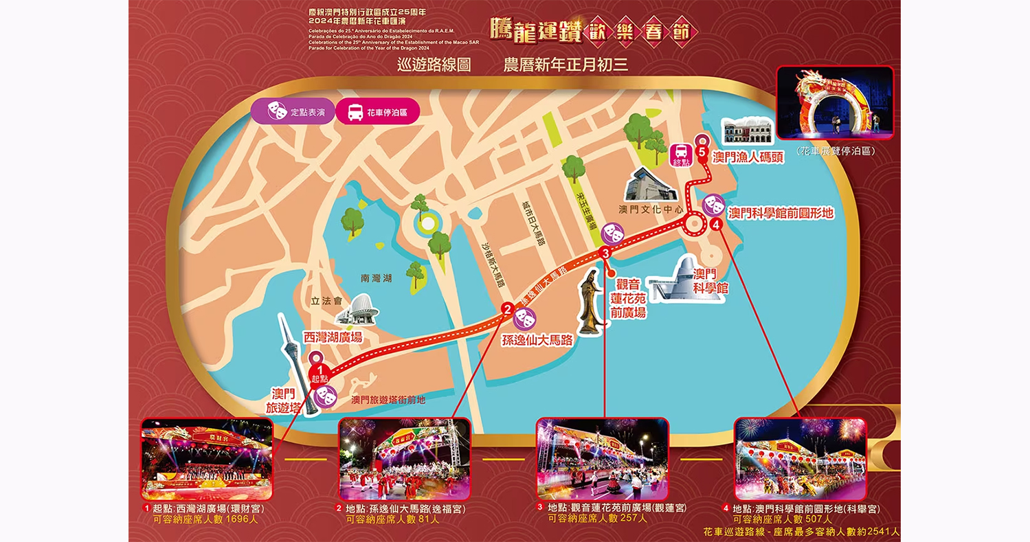 巡遊路線:西灣湖廣場→孫逸仙大馬路→澳門科學館→澳門漁人碼頭