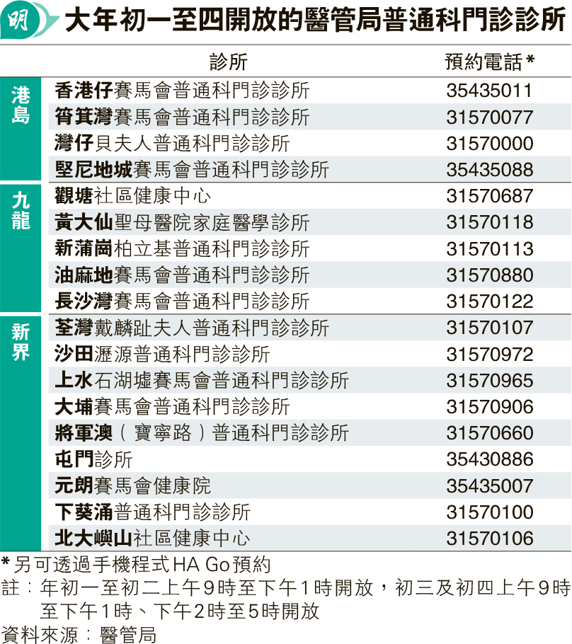 【明報專訊】本港正值流感高峰期,醫管局昨日公布推出多項措施應對農曆新年服務需求高峰,包括增加急症室人手等。該局總行政經理(聯網運作)李立業稱,農曆新年求診需求會逐漸增加,預計初三及初四將是求診高峰期,近日氣溫下降,新冠或流感病毒趨活躍,長者慢性病病情或會加劇,跌倒風險可能增加,在私家診所支援減少下,預計加重醫管局整體壓力。