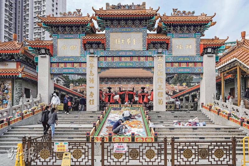 穿過山門轉左上電梯,率先去到第二參神平台。平台仿中國宮殿建築形制,兩邊擺放一對6米高的華表裝飾,柱身刻上祥雲騰龍等紋飾,頂部雕有傳統瑞獸。步往大殿的石階中間裝有一塊刻上9條龍的石雕,就似宮殿中的御路踏跺,可見黃大仙地位之高。當天剛好遇上工人繪畫石雕,是其建成以來首次加上彩繪工藝,李道長稱期望增加廟宇的「藝術性」。