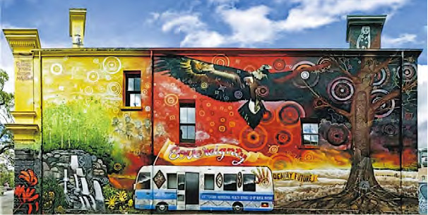 從市中心坐幾個站電車或散步到Fitzroy(斐茲洛伊區),你會發現,這個城市到處都有很多街頭藝術(street art)。走到136 Gertrude Street就能看到一大幅由原住民藝術家Robert Michael Young設計、Heesco及Mike Makatron畫的壁畫(mural)——Celebration Dreaming(2017)①。