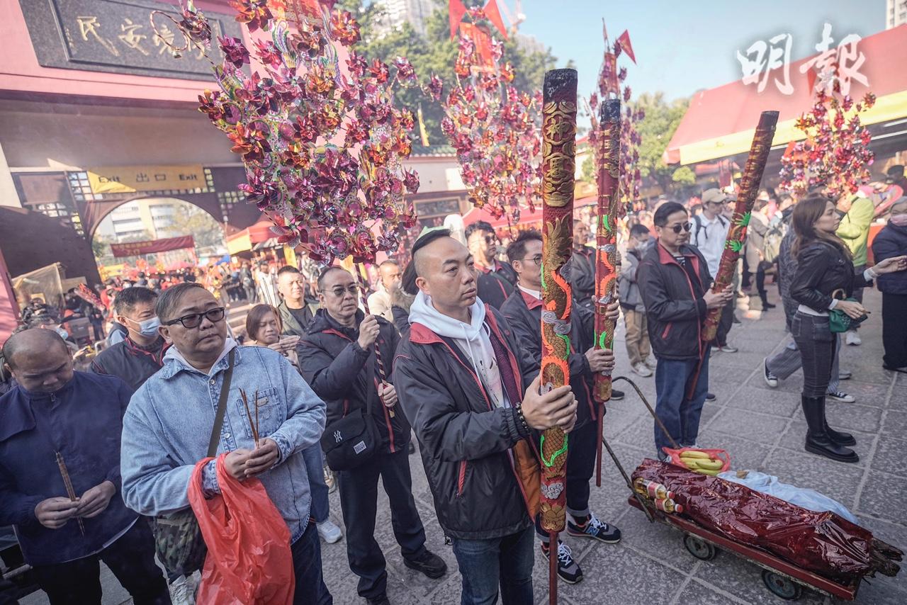 場外的車公誕市場有售風車及線香等,擺檔18年的檔主曹先生去年曾稱因人流管制安排導致人流稀疏,他今早則指早上人流與去年相若,銷情起碼少3成,形容為慘况,直言明年競投攤檔時要「度一度」。另一擺檔逾10年的檔主江小姐亦稱今早的人流及銷情未如理想,估計與港人北上拜年有關,但她相信下午人流會增加。