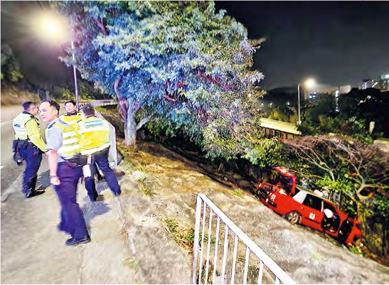 【明報專訊】牛池灣昨凌晨40分鐘內發生兩宗車禍。其中一輛的士在清水灣道懷疑因閃避動物衝落山坡,司機及乘客一度被困,兩人輕傷送院。另一輛私家車在飛鵝山失控撞沙井險墮山。