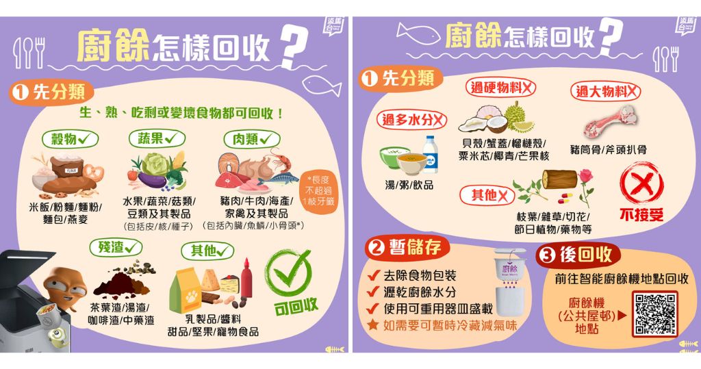 廚餘回收可減少浪費,全港至今有70個公共屋邨設有智能廚餘回收桶,但回收廚餘有何注意?是否所有廚餘都可回收?政府「添馬台Tamar Talk」facebook發布廚餘回收小貼士,教大家先將廚餘分類、將可回收的廚餘去除食物包裝、瀝乾水分暫儲存等。