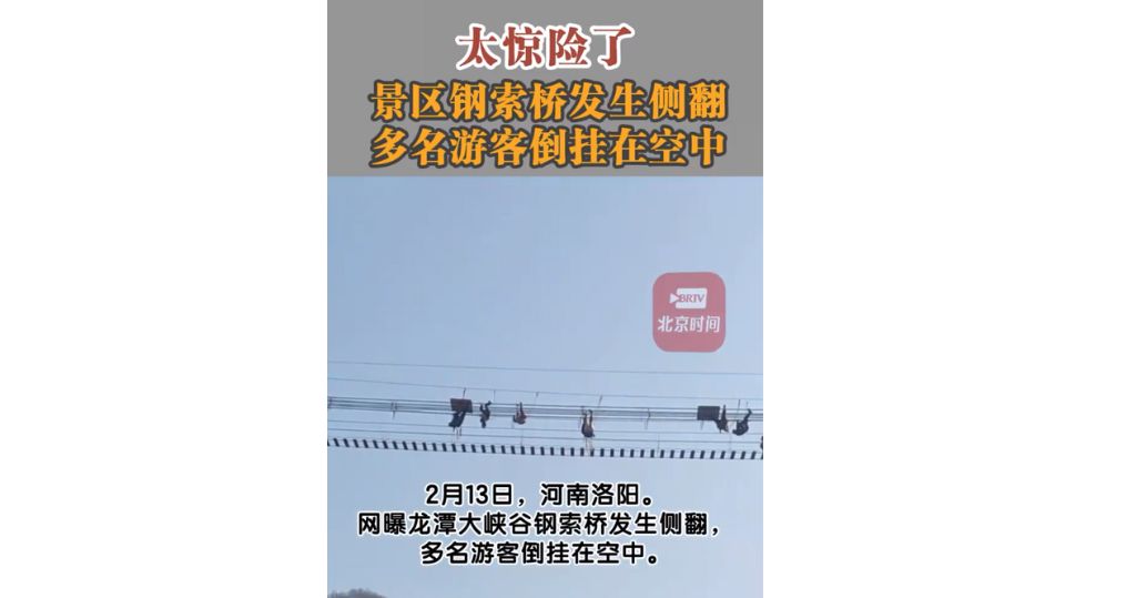 河南洛陽新安縣龍潭大峽谷景區昨(13日)發生驚險一幕,景區內一條「網紅」鋼纜吊橋側翻,身處橋上的多名遊客一度被倒掛在高空,稍後所有被困遊客已獲救,無人受傷。