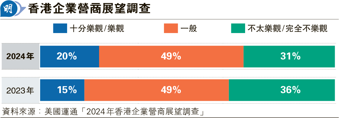 【明報專訊】美國運通公布「2024 年香港企業營商展望調查」結果,報告指隨着本港自去年初開始通關,商業活動亦陸續復常,本地企業對今年的整體營商信心較去年有略為改善。有兩成受訪的本地企業對今年營商環境感到樂觀或十分樂觀,較去年上升5個百分點(見圖);惟仍有49%企業仍對對今年營商環境抱持平態度,與去年持平;而31%企業則表示不太樂觀或非常不樂觀,較去年跌5個百分點。