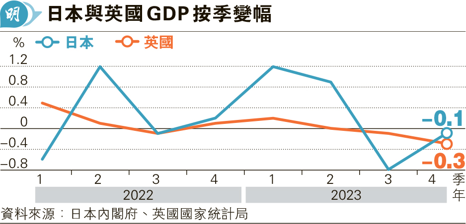 【明報專訊】通脹高企影響消費需求,日本與英國第四季GDP按季收縮,連續兩季經濟倒退,陷入技術性衰退。市場原預期日本去年底經濟重拾增長,但其實際GDP繼第三季向下修訂至按季收縮0.8%後,第四季出乎意料按季再跌0.1%。受日圓貶值等因素影響,日本去年的名義GDP為4.2萬億美元,被德國的4.46萬億美元超越,經濟規模跌至全球第四。名義GDP首兩位仍是美國和中國。