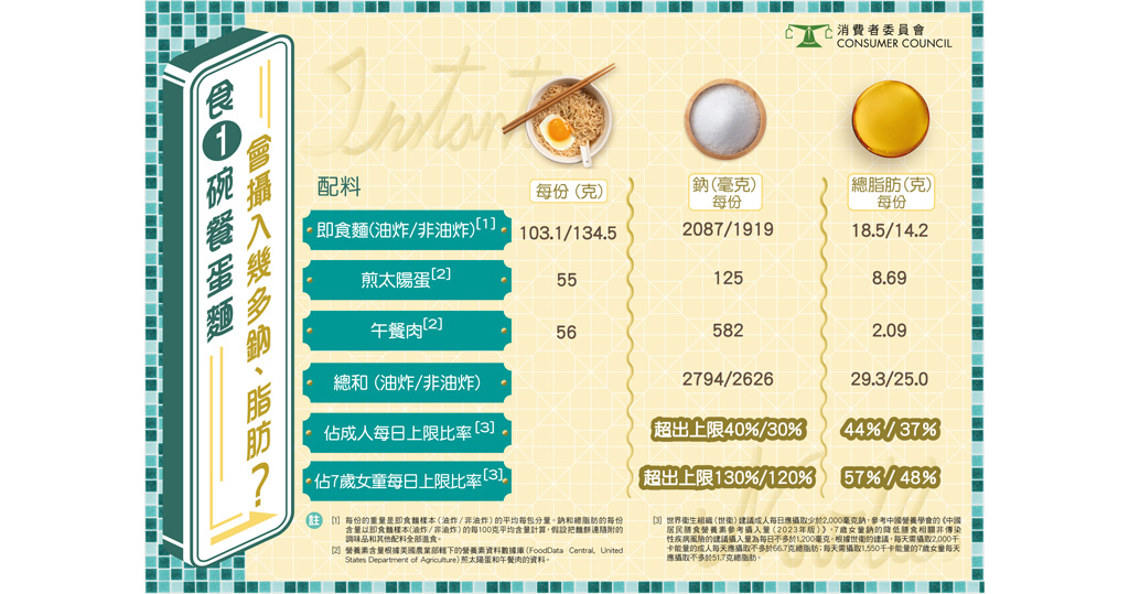 即食麵美味可口,但小心攝取過量鈉和脂肪。消委會舉例稱,一碗餐蛋麵的鈉量超出成人每日上限四成,脂肪亦佔了建議每日攝取的四成。至於即食麵會否致癌?什麼人不適合食用即食麵?本文整合消委會解答5條與即食麵相關的常見問題。