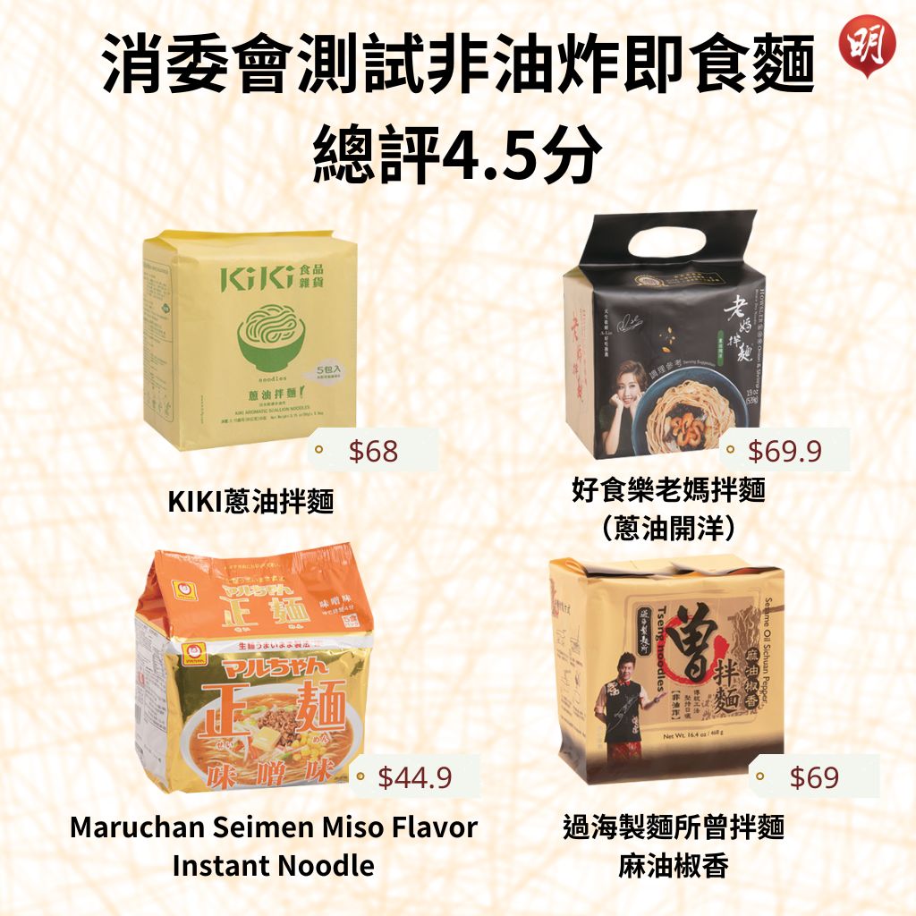 即食麵方便快捷,是不少人的速食首選。消委會測試19款預先包裝即食麵樣本,包括14款油炸麵及5款非油炸麵,其中4款非油炸麵總評獲4.5分,分別為KIKI蔥油拌麵、好食樂老媽拌麵(蔥油開洋)、Maruchan Seimen Miso Flavor Instant Noodle,以及過海製麵所曾拌麵-麻油椒香。