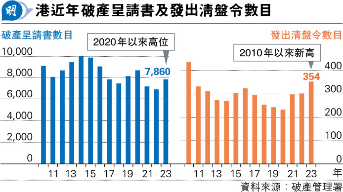 【明報專訊】破產管理署昨日公布1月破產及清盤相關數字,破產呈請書數目及發出清盤令數目均達兩個月以來的高位。今年1月破產呈請書753宗,按月升11.56%,按年亦升五成,為自去年11月的814宗的高位;上月發出清盤令的數目達22宗,按月跌15.38%,按年則升29.41%,為去年11月35宗的高位;若按年計,去年破產呈請書數目及清盤令數目分別達7860宗和354宗,為2020年及2010年以來的新高(見圖)。