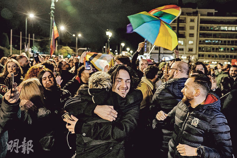 【明報專訊】希臘國會周四(15日)以176票比76票,通過將同性婚姻列為合法,成為首個東正教國家兼第16個歐盟成員國同性婚姻合法化,法例又容許已婚同性伴侶有成為兒童監護人的權利。希臘2015年起認可同性戀人士「民事伴侶關係」,中間偏右新民主黨總理米佐塔基斯去年競選時便承諾將進一步推動同性婚姻合法化,他讚揚新法通過「消除了對不少民眾的歧視」。家庭及性小眾團體歡迎新法。惟希臘人口仍以尊崇傳統家庭價值的東正教徒為主,大批東正教支持者及極右人士近期在首都雅典等地,手持十字架和標語,舉行誦經示威反對立法;希臘東正教會雅典總主教耶羅尼莫斯二世批評新措施「侵害社會凝聚力」。