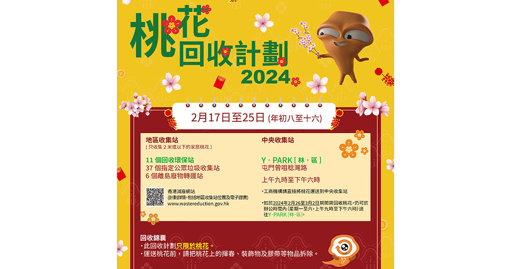 春節過後,如要棄置2米或以下的桃花,可考慮送往地區收集站。環保署透過Y‧PARK [林‧區]承辦商在指定地點回收桃花,將合適的桃花循環再造成再生產品,轉廢為材。市民拆除桃花上的裝飾物,2月17日至25日期間可將桃花送往55個指定收集站。2月26日至3月2日則可將桃花直接送往屯門曾嘴Y.PARK[林.區]。[詳情][55個桃花收集站一覽]