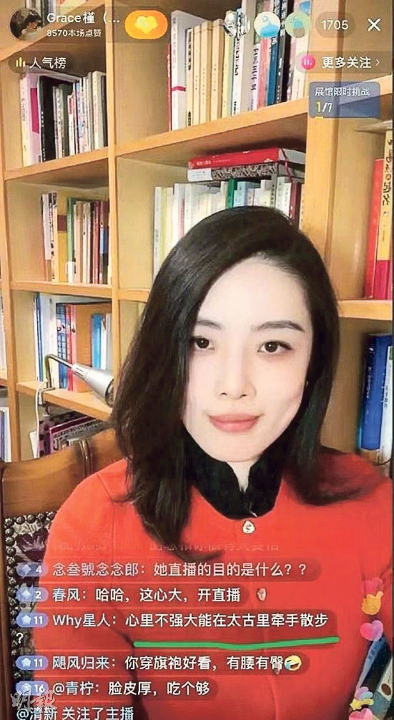 【明報專訊】四川成都太古里去年6月爆出「國企領導牽手門」事件,近日「牽手門」事件女當事人、被網民稱為「石油姐」的董姓女子(圖,網上圖片)在短片平台開直播,疑似回應牽手門事件,帳號不久即遭封禁。