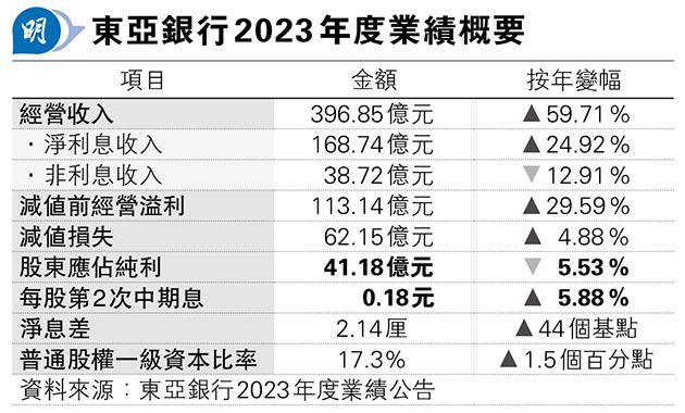 【明報專訊】東亞銀行(0023)昨公布2023年度業績,期內由於沒有如前一年般出售藍十字保險等收益,純利按年減少5.53%至41.18億元,較市場預期的55.3億元遜色。每股第二次中期息按年增派5.88%至0.18元。雖然該行宣布新的5億元股份回購,但股價昨最多曾跌4.38%,收市時跌幅收窄至1.04%至9.48元。