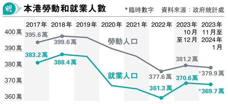 【明報文章】政府統計處日前公布最新的人口數字,節錄其新聞稿如下:「2023年年底香港人口的臨時數字為7,503,100人。與2022年年底人口7,472,600人比較,增加30,500人,升幅為0.4%。2022年年底至2023年年底的人口上升,主要由於期間錄得51,700名香港居民淨移入(即移入多於移出),包括40,800名單程證持有人的移入,以及10,800名其他香港居民的淨移入。在同期內,人口錄得21,200人的自然減少(即死亡多於出生),出生人數為33,200人,死亡人數為54,400人。」
