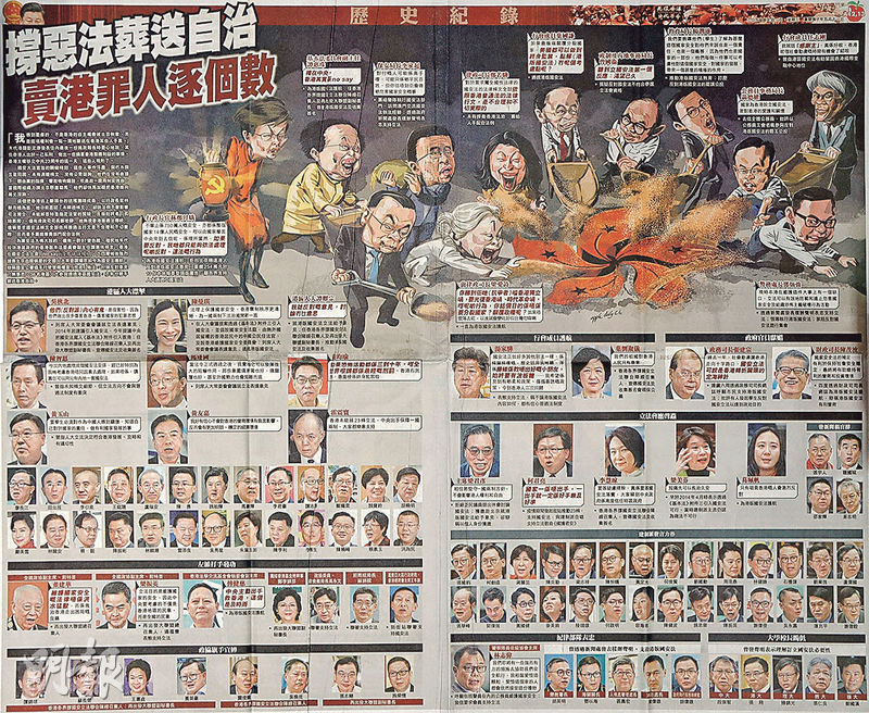控方助理刑事檢控專員張卓勤昨日首先呈遞《蘋果》在國安法生效的7月1日發布之報道〈撐惡法葬送自治 賣港罪人逐個數〉,當中詳列支持國安法立法的時任特首林鄭月娥、前特首董建華、梁振英、港區人大及政協等人的圖片。陳沛敏稱,報道是記錄這批人在國安法立法過程的角色及態度,不記得是誰首先提議製作,「但係都係我同意嘅」,亦反映黎的取態。