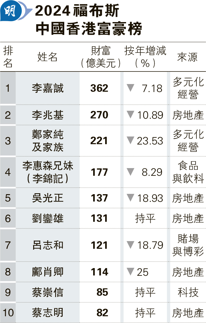 福布斯2024港富豪榜 李嘉誠蟬聯首富