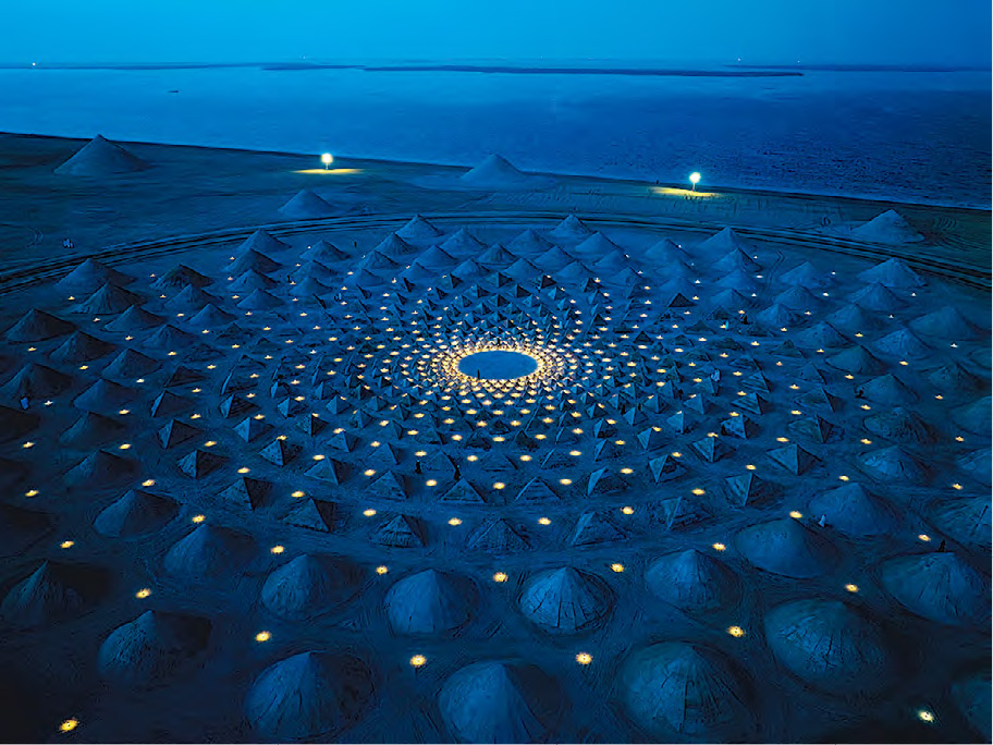 香港人為什麼總愛計較又沒耐性?應該是因為資源不夠吧。在阿聯酋很多生活小細節也令我意識到,當一個地方有空間有資源,大家會變得很大方。藝術創作可算是抽象地記錄生活的方式,受生活環境影響外,貼地一點去想,資源也直接影響創作成效。剛閉幕的「Manar Abu Dhabi」是由阿布扎比文化及旅遊局籌備的公共藝術節,而當中藝術作品的規模都是令人驚歎的。「Manar」在阿拉伯語中意指光屋,是一個以光藝術為主,為期3個月的藝術節。是次委約了多名國際及本地藝術家,為城市各個空間設計作品,當中甚至有作品佔據了整個島嶼。我們最為深刻的是於Fahid Island展出、由美國藝術家Jim Denevan創作的Self Similar(2023)。Denevan善於運用地勢及自然環境創作大地藝術,曾在多個地方如俄羅斯貝加爾湖創作。這次Denevan在將近1平方公里(約100公頃)的平地上建了448座大細不一的金字塔,組成一個曼陀羅。每天黃昏5時起開放給公眾,讓大家可以一次觀賞作品在白天及黑夜時的狀態。當天色漸漸由明轉暗,金字塔群中間的太陽能燈泡會亮起,為觀者引路。燈光會引領登上金字塔形的觀賞塔,從那裏可以鳥瞰整件作品,看到金字塔群所組成的曼陀羅圖案,十分壯觀。縱然此作沒有特定的宗教指涉,整趟體驗很是療癒。