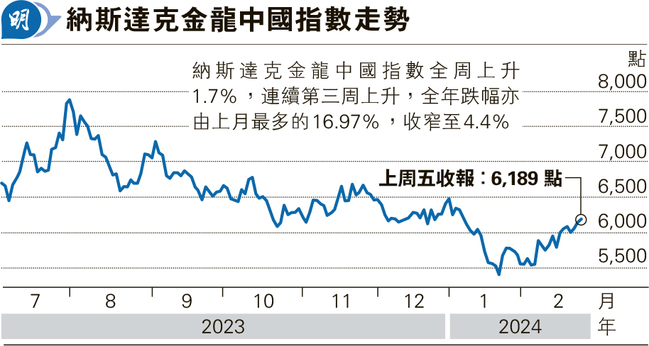 【明報專訊】反映在美上市中概股表現的納斯達克金龍中國指數,上周五收報6189點,上升0.66%,全周上升1.7%,連續第三周上升,為去年7月中以來首次,全年跌幅亦由上月最多的16.97%,收窄至4.4%。