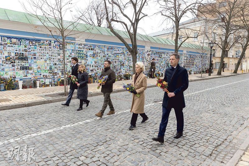 上述4名西方領袖從波蘭乘坐通宵列車於昨日抵達基輔,馮德萊恩在社交平台稱,此行「為慶祝烏克蘭民眾非比尋常的抵抗力量」,表示西方「比任何時候都更堅定支持烏克蘭,包括財政、經濟、軍事和道德上」,而這將「直至該國最終獲得自由」。杜魯多和梅洛尼昨跟烏克蘭總統澤連斯基簽訂新的安全協議,後者之後主持七國集團(G7)視像峰會,澤連斯基列席。法總統馬克龍昨發聲明,警告俄總統普京「勿指望歐洲人會厭倦(戰事)」,馬克龍另在社交平台強調援烏承諾不會動搖。英國首相辛偉誠亦指,英國「準備不論代價和時間」支持烏克蘭直至勝利。