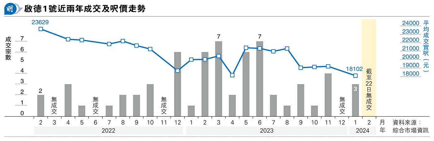 【明報專訊】新《財政預算案》本周三(2月28日)出台前夕,市場觀望港府會否再度減辣,一二手物業交投持續淡靜;其中屬新盤供應重鎮的啟德區,向來以一手成交為主,二手交投向來較疏落,屬「港人港地」項目的啟德1號,2月截至22日止,仍未錄二手買賣成交,而上月3宗成交個案的平均實呎約為1.81萬元,料屬近兩年新低。
