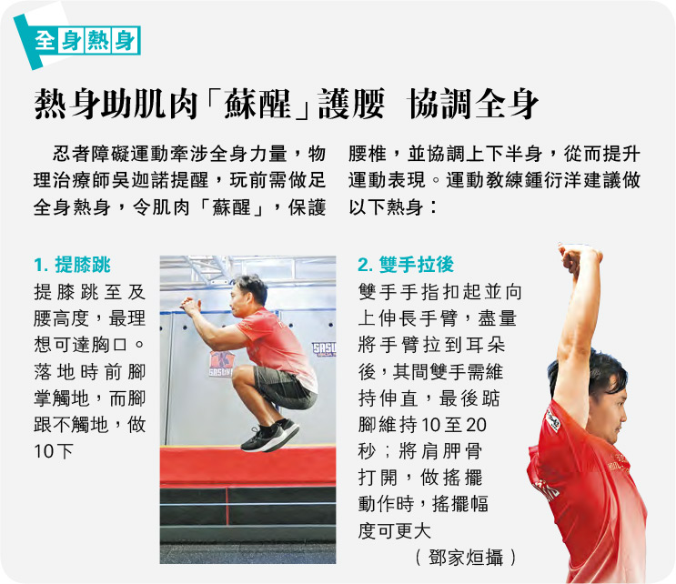 副刊 全身熱身:熱身助肌肉「蘇醒」護腰 協調全身 發佈於 2 年 前 2024 年 2 月 26 日 By 明報 【明報專訊】忍者障礙運動牽涉全身力量,物理治療師吳迦諾提醒,玩前需做足全身熱身,令肌肉「蘇醒」,保護腰椎,並協調上下半身,從而提升運動表現。運動教練鍾衍洋建議做以下熱身: 1. 提膝跳 提膝跳至及腰高度,最理想可達胸口。落地時前腳掌觸地,而腳跟不觸地,做10下 2. 雙手拉後 雙手手指扣起並向上伸長手臂,盡量將手臂拉到耳朵後,其間雙手需維持伸直,最後踮腳維持10至20秒;將肩胛骨打開,做搖擺動作時,搖擺幅度可更大 [健康] 相關文章: Up Next 俠醫仁心:玉不琢不成器 不要錯過 4大類障礙關卡 各有考驗 繼續閱讀 贊助商 猜你喜歡