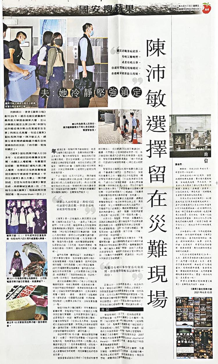 另外,控方圍繞黎智英2020年8月被捕後的情况提問。8月13日《蘋果》頭版報道〈黎智英羈留室感悟 「坐監都揀呢條路」〉,黎訪問中表達在羈留室的感悟時稱,「將來瞓喺監獄,whatever(無論如何),我都係會揀呢條路」。控方關注黎有否指示《蘋果》改變編採方向,陳稱沒有。至於陳是否根據黎的觀點管理《蘋果》,陳表示「基本上係」,並解釋因「佢係老闆啦,同埋佢都係比較強勢嘅作風」,一直堅持其做法正確。陳認同黎一些宏觀或基本價值觀,如民主自由,但若說到一些具體做法、路線,「我又唔覺得我會每次都認同」。