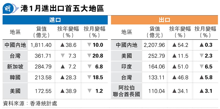 按地區劃分,期內輸往亞洲的整體出口貨值按年上升45.7%。當中,中國內地按年升幅擴大至54.2%,貨值為2207.96億元(見表),按月相若;值得留意是,輸往阿拉伯聯合酋長國的整體出口貨值創歷來單月新高,錄得110.04億元,升幅亦由5%明顯加快至34.1%。另一方面,來自中國內地的進口按年升38.6%,惟按月跌10%;台灣、韓國和日本的進口分別按年跌7.3%、升28.3%及升15.9%。